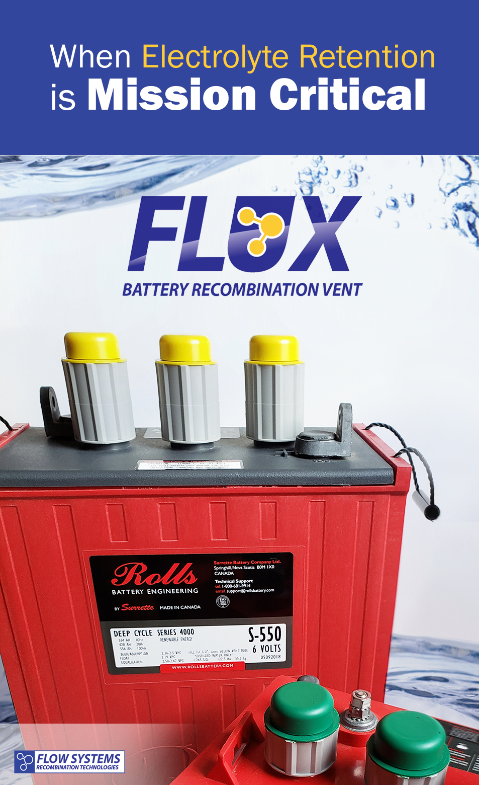 In addition to testing the FLUX Recombination vent in a third party lab setting, we periodically have our vents tested in the field. Each battery system is different from the charger, to the size of the battery and to even the elevation at which the battery operates. All these different variables, contribute to a different operating environment than what might be present in a laboratory. To make sure the FLUX Recombination Battery Vent operates effectively across a wide range of possible scenarios, we periodically have individuals test them on their systems. These range from home based solar systems to commercial storage banks.